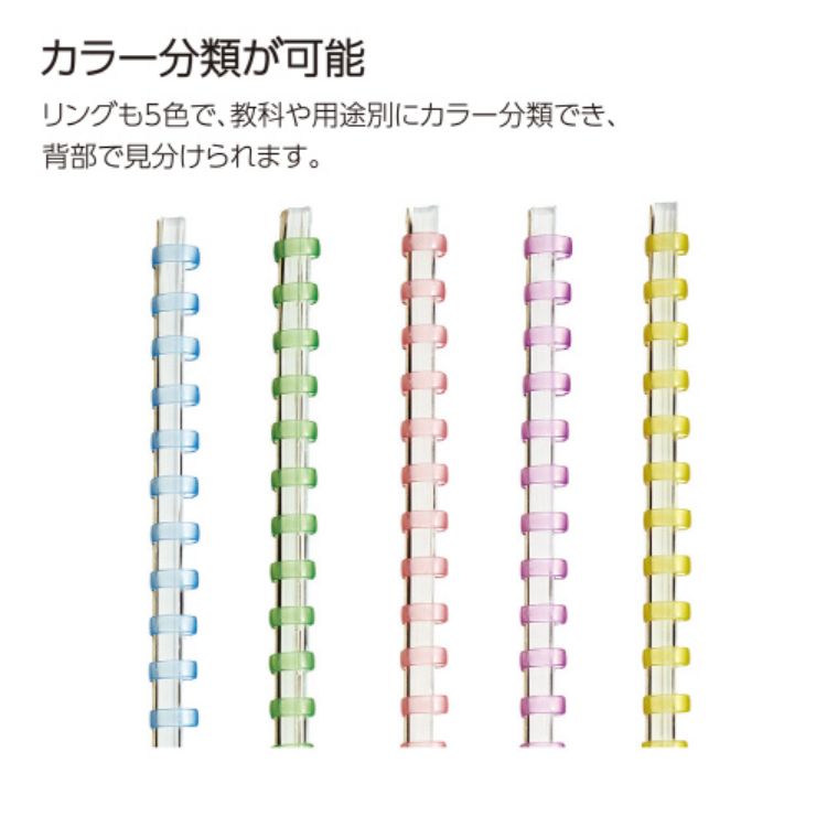- リングに色がついているので、色ごとに用途や教科分けした際、背で見分けることができます。