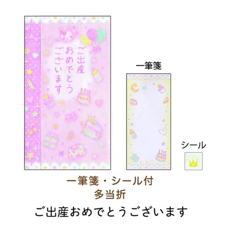 - 赤ちゃんの誕生をお祝いするのにぴったりなやさしい色合いのモチーフがたくさんでかわいらしい祝儀袋 ※多当折 【内容】一筆箋、シール付